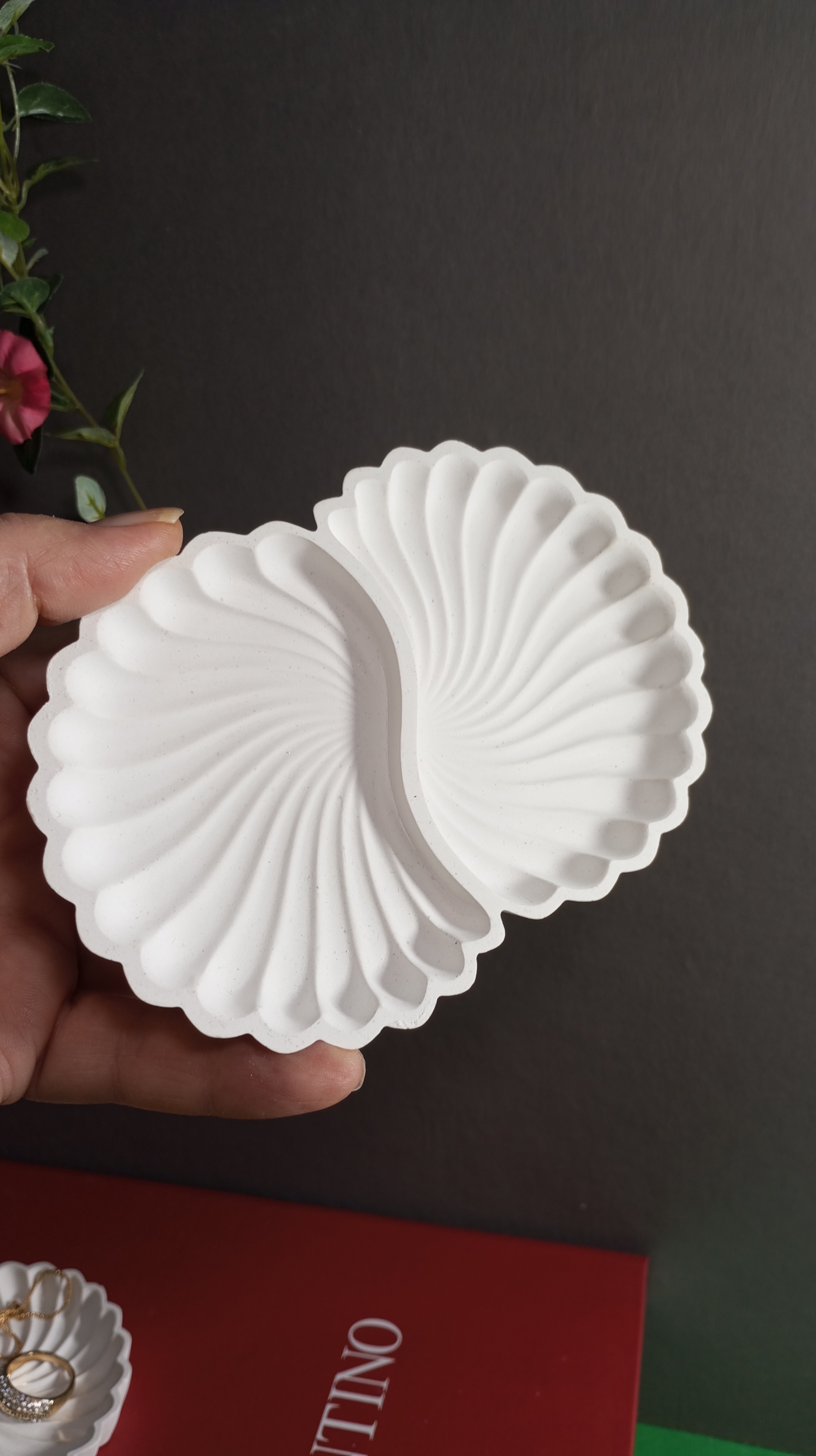 ظرف دو قلو بیضی و گرد صدفی با طرحی خاص و متفاوت یه کار جذاب برای اکسسوری، زیورآلات،ظرف هفت سین ، و دکور روی میز این ظروف بخاطر داشتن دو بخش مجزا کاربردی متفاوت داره از این کارها برای عکاسی زیورآلات می تونین استفاده کنید قالبهاشون از بهترین سیلیکون بازار ساخته میشه و بدون حباب و کاملا نرم و منعطف هستش